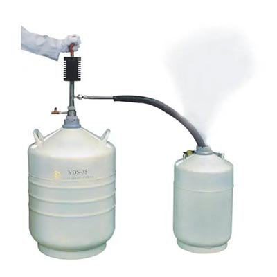 該產(chǎn)品依靠操作者手捏吸液球(ZYB-5型),使液氮容器內(nèi)貯存的液氮少量產(chǎn)生氣化。由于液氮的氣液體積比較大,氣化后的氮?dú)庠诿芊獾娜萜鲀?nèi)對(duì)盛裝的液氮增壓,促使容器內(nèi)盛裝的液氮排放出來,達(dá)到對(duì)其它容器補(bǔ)充液氮的目的。它具有操作方便可靠、排液過程中液氮的蒸發(fā)損失低的優(yōu)點(diǎn)。